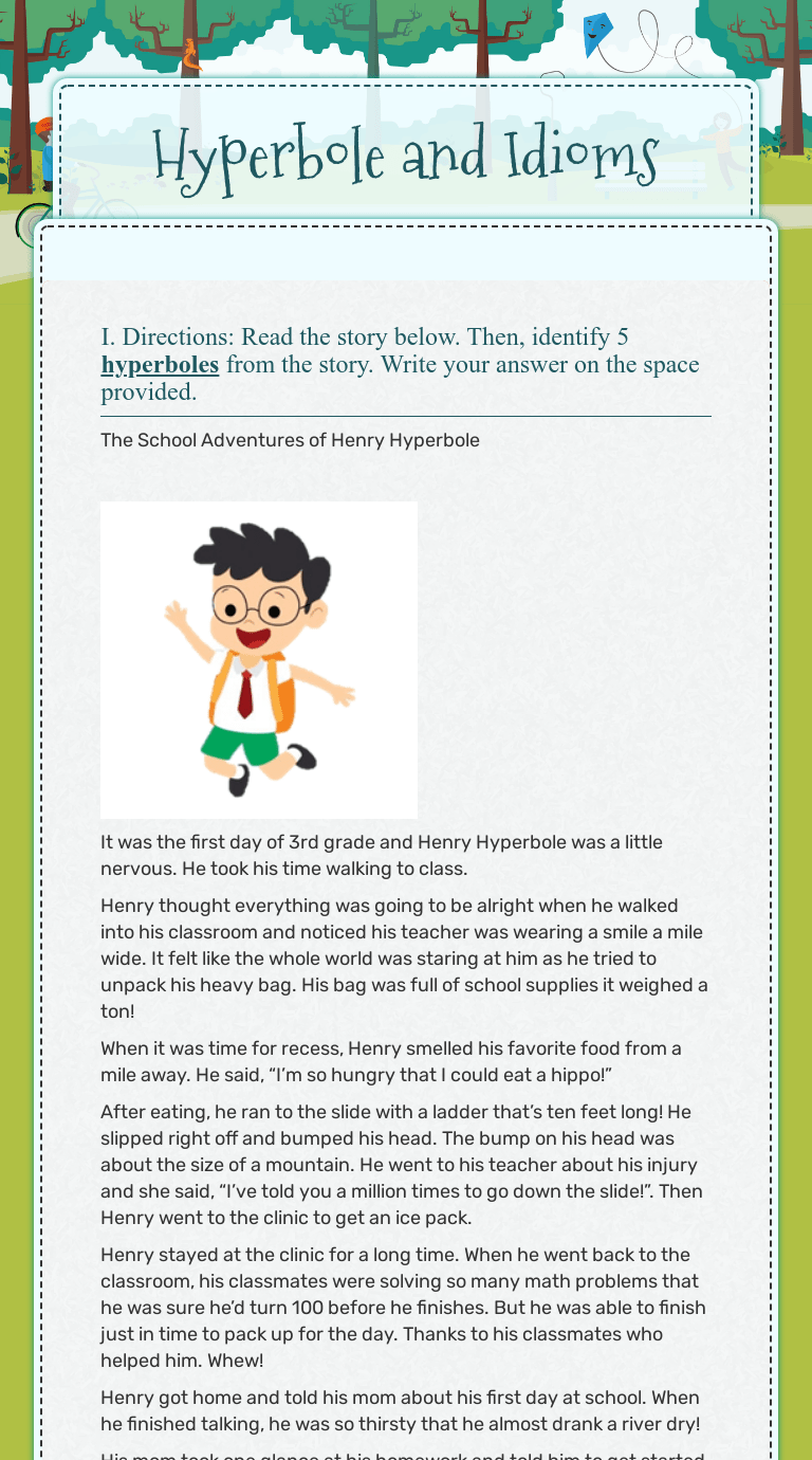 This is often used to make a significant point and to . It was the first day of 3rd grade and henry hyperbole was a little nervous. You will draw a picture of one hyperbole identified in the book and explain its real meaning (orally or in writing). Ideal for fourth and fifth graders, this worksheet includes figurative language examples and definitions on the first page, and a second full page of . A hyperbole is a literature technique that intentionally exaggerates a piece of information, emotion, .